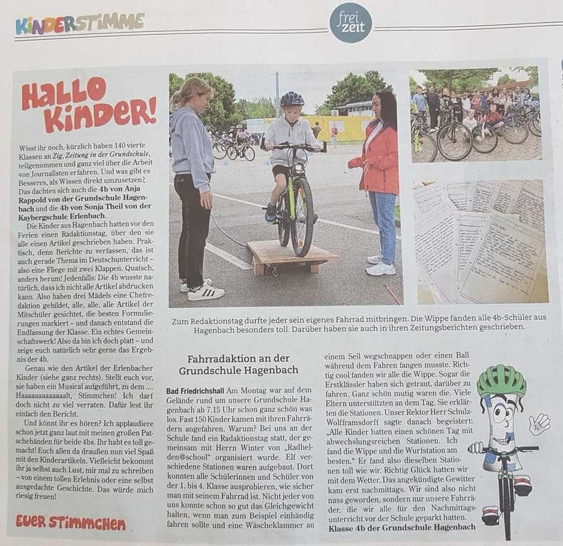 Vor den Osterferien haben die Viertklässler ihre Radfahrausbildung erfolgreich abgelegt. Im Unterricht wurde zuvor alles erarbeitet, was anschließend für die Praxis gewusst werden musste. An zwei Terminen trainierten die Schüler gemeinsam mit der Polizei im geschützten Bereich auf dem Parkplatz. Am dritten Termin übten die Viertklässler im Realverkehr für die Prüfung, welche am vierten Termin stattfand. Neben dieser praktischen Prüfung mussten alle Schüler auch eine theoretische Prüfung ablegen.