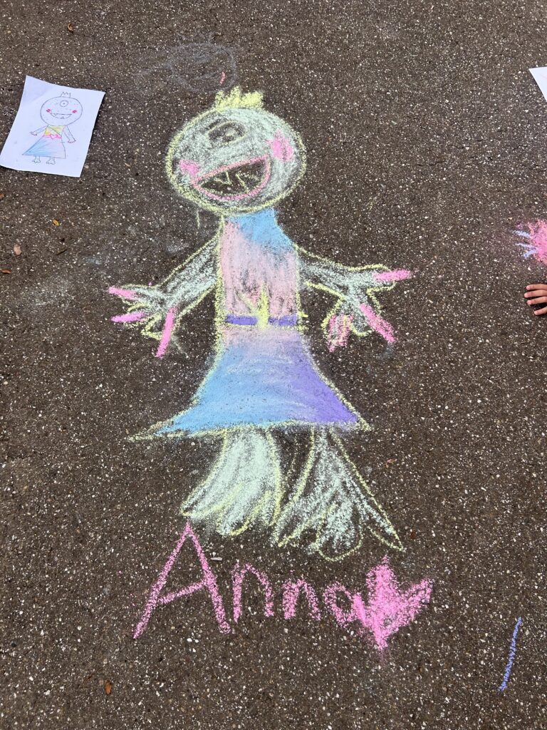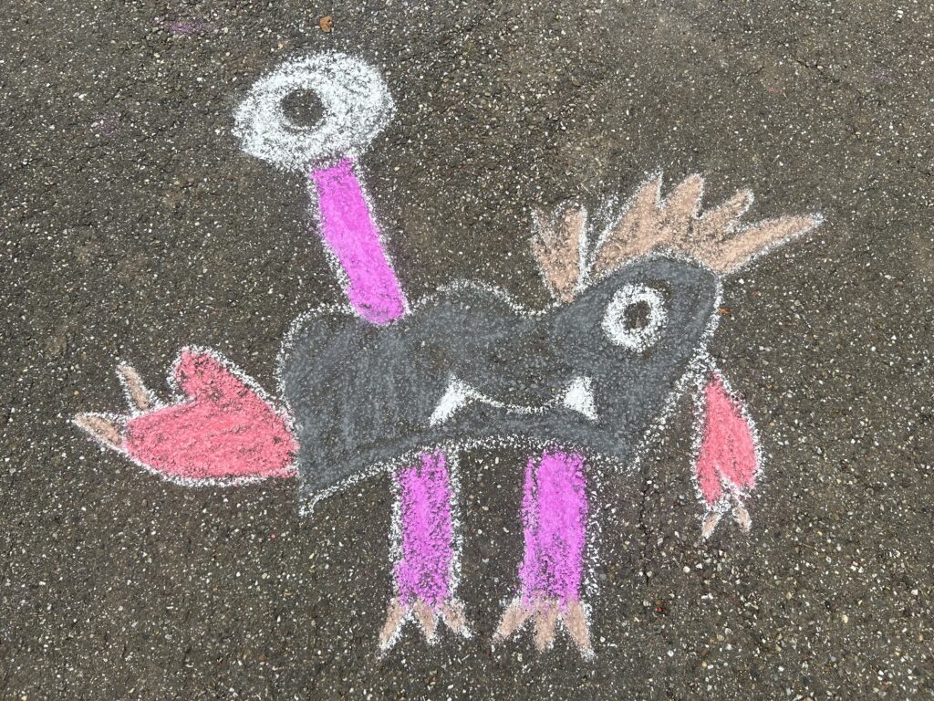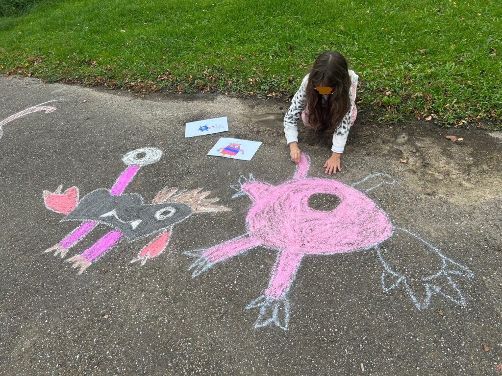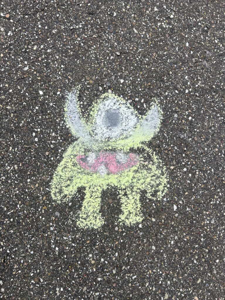 Mit viel Begeisterung und Kreativität ging es danach an die Umsetzung: Auf dem Schulhof entstanden mit bunter Kreide zahlreiche fröhliche Monster, die den grauen Schulhofboden in kleine Kunstwerke verwandelten.