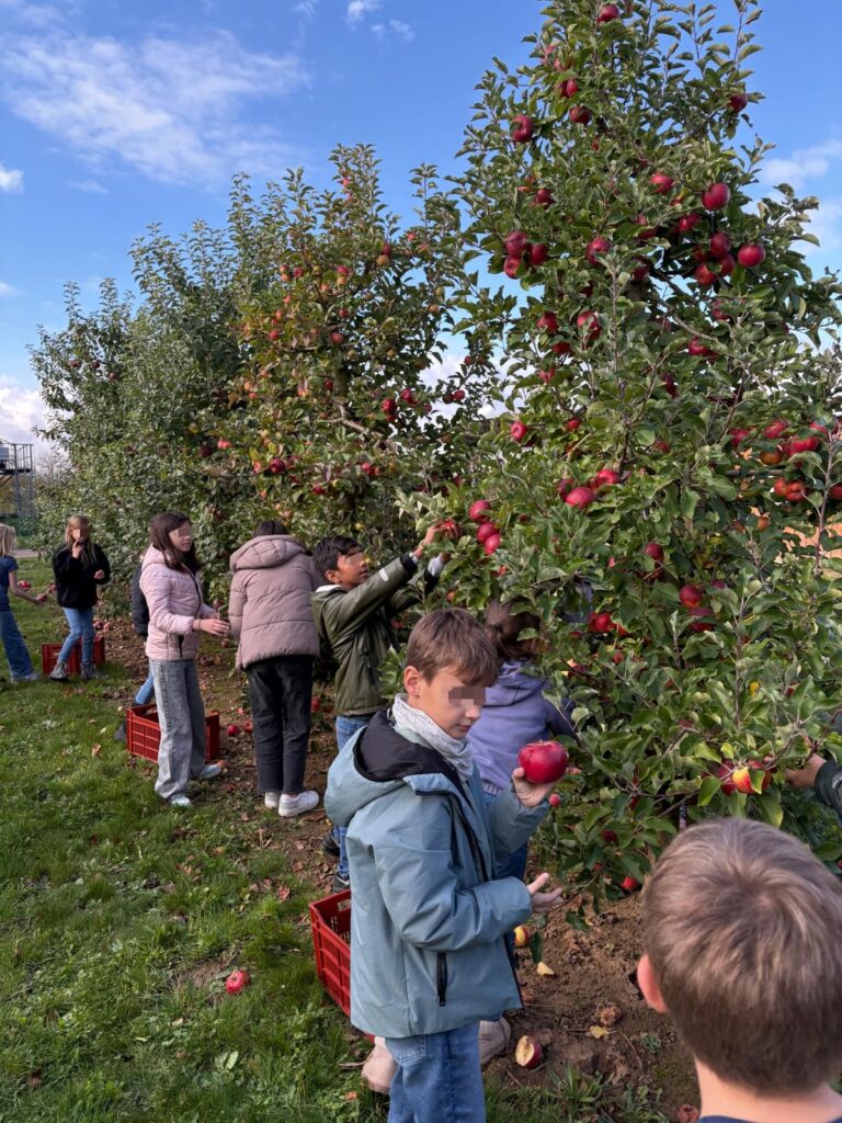 Natürlich durfte auch eine eigene Apfelernte nicht fehlen. Eifrig pflückten die Kinder Äpfel direkt vom Baum. Anschließend besichtigten sie den großen Wasserbehälter, der zur Bewässerung des Obstgutes dient, und lernten, wie wichtig Wasser für gesunde Pflanzen ist.