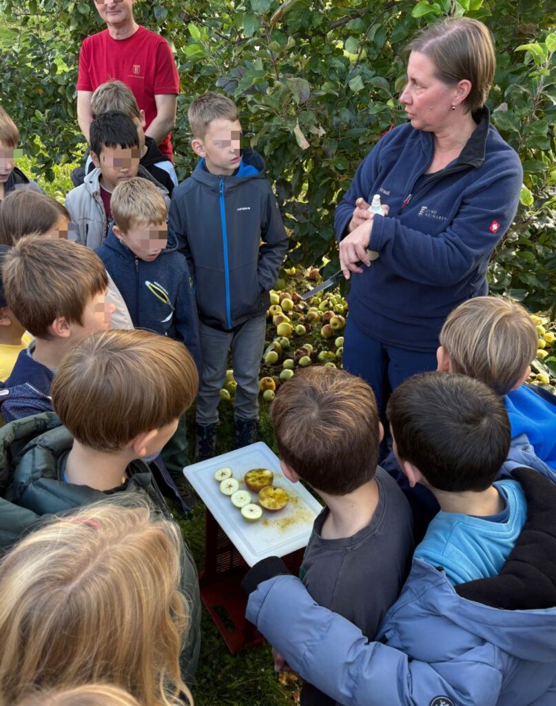 Im Anschluss ging es mit einem Traktorzug weiter zu den Apfelbäumen. Dort erfuhren die Schüler viel Spannendes über den Apfelanbau und durften drei verschiedene Apfelsorten verkosten. Schnell merkten alle, dass Äpfel nicht gleich Äpfel sind – jede Sorte schmeckte ein bisschen anders!