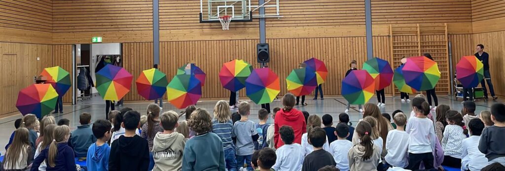 Die Klasse 3a zeigte danach einen weiteren kreativen und kunterbunten Regenschirmtanz.