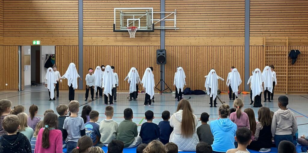 Die Klasse 4a stellte spannende Fakten rund um unsere Schule vor und beantwortete in ihrem Beitrag „Wusstest du schon?“ Fragen, die selbst für manche Lehrkraft neu waren. Danach brachte die Klasse 2b mit dem Tanz „Gespenster am Fenster“ Bewegung und gute Stimmung in die Halle.